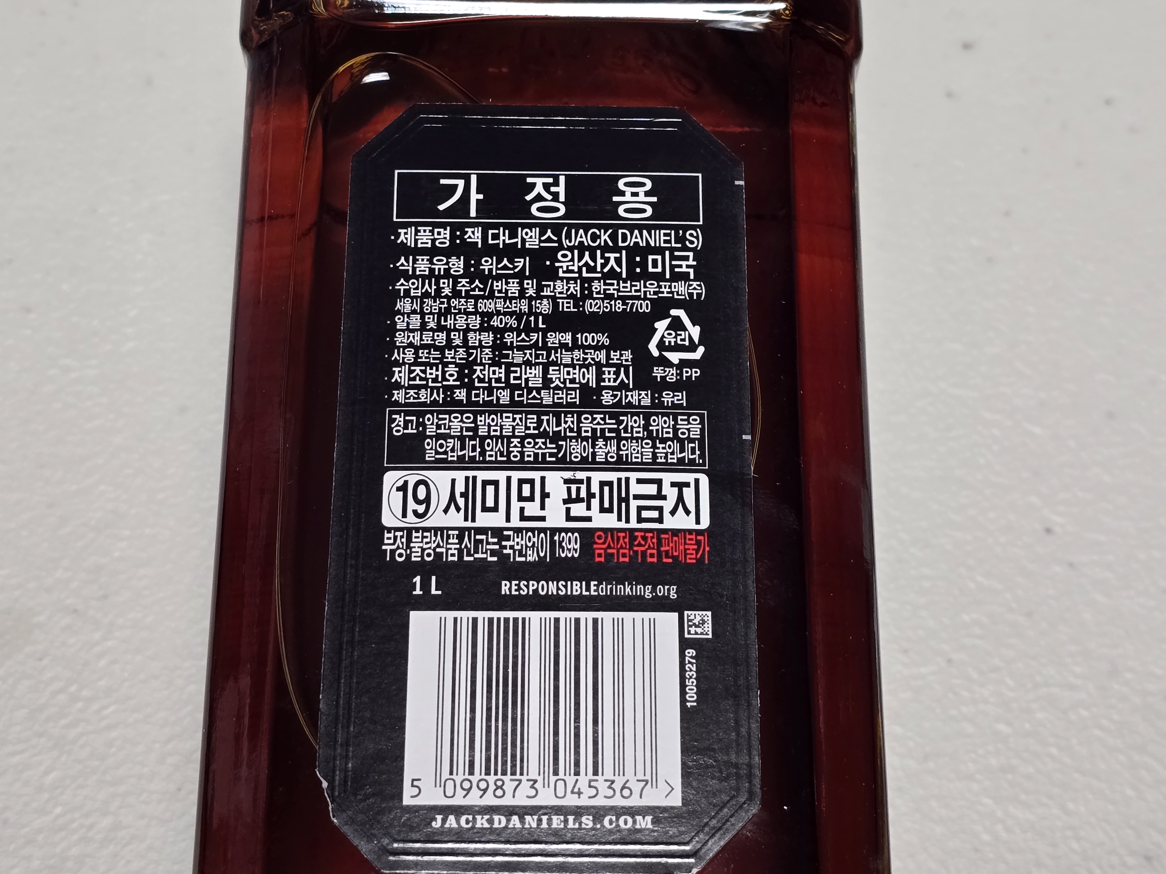 잭다니엘 본품은 1L 짜리 위스키 원액 100%로 구성되어 있습니다. 다른 이름 없이 제품몉에 잭 다니엘스라고 적혀있는 것을 보니 이 제품이 가장 기본이 되는 제품인 것 같습니다.